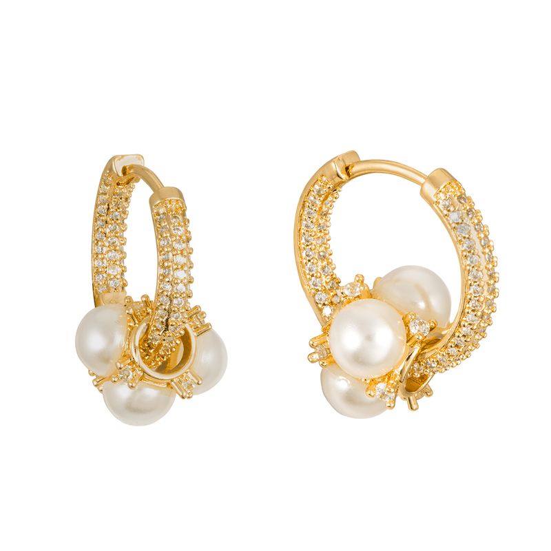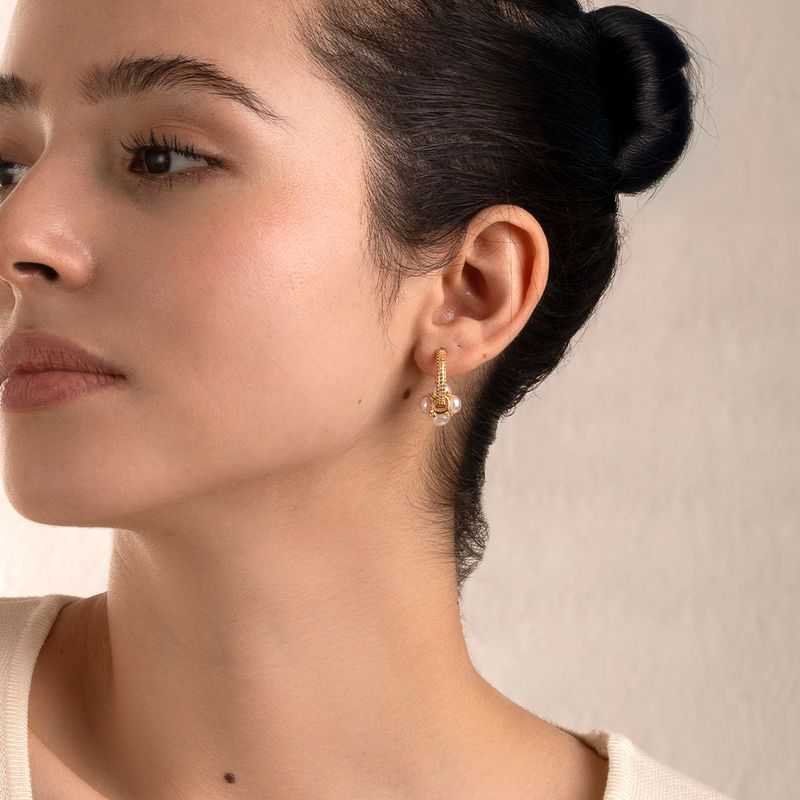 Belleza que trasciende el tiempo. Arete tipo huggies con zirconia y perlas elaborado en chapa de oro 18K.