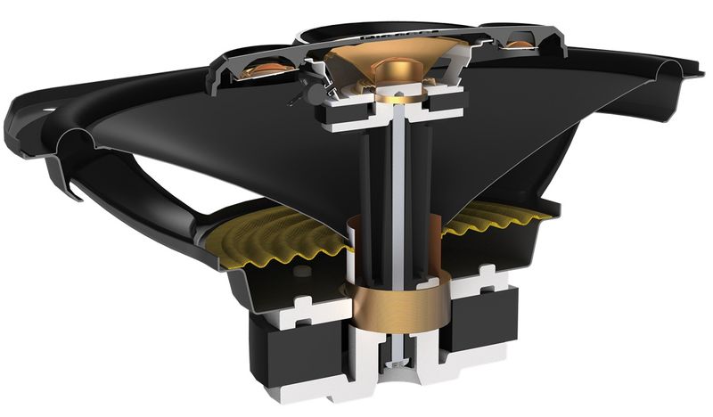 Alto rendimiento – Forma de cono optimizado para una estructura poco profunda. La estructura utiliza un cono altamente rígido y duradero hecho con resina moldeada por inyección MICA para producir bajos potentes y precisos