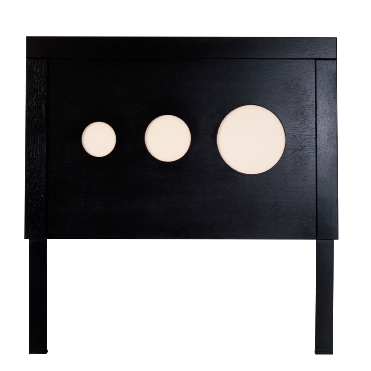 Redefine el concepto de tu habitación con esta pieza que equilibra la fuerza del color negro con la fluidez de las formas orgánicas. Cabecera de madera en acabado negro con detalles decorativos circulares que aportan un estilo contemporáneo y elegante a la recámara.
