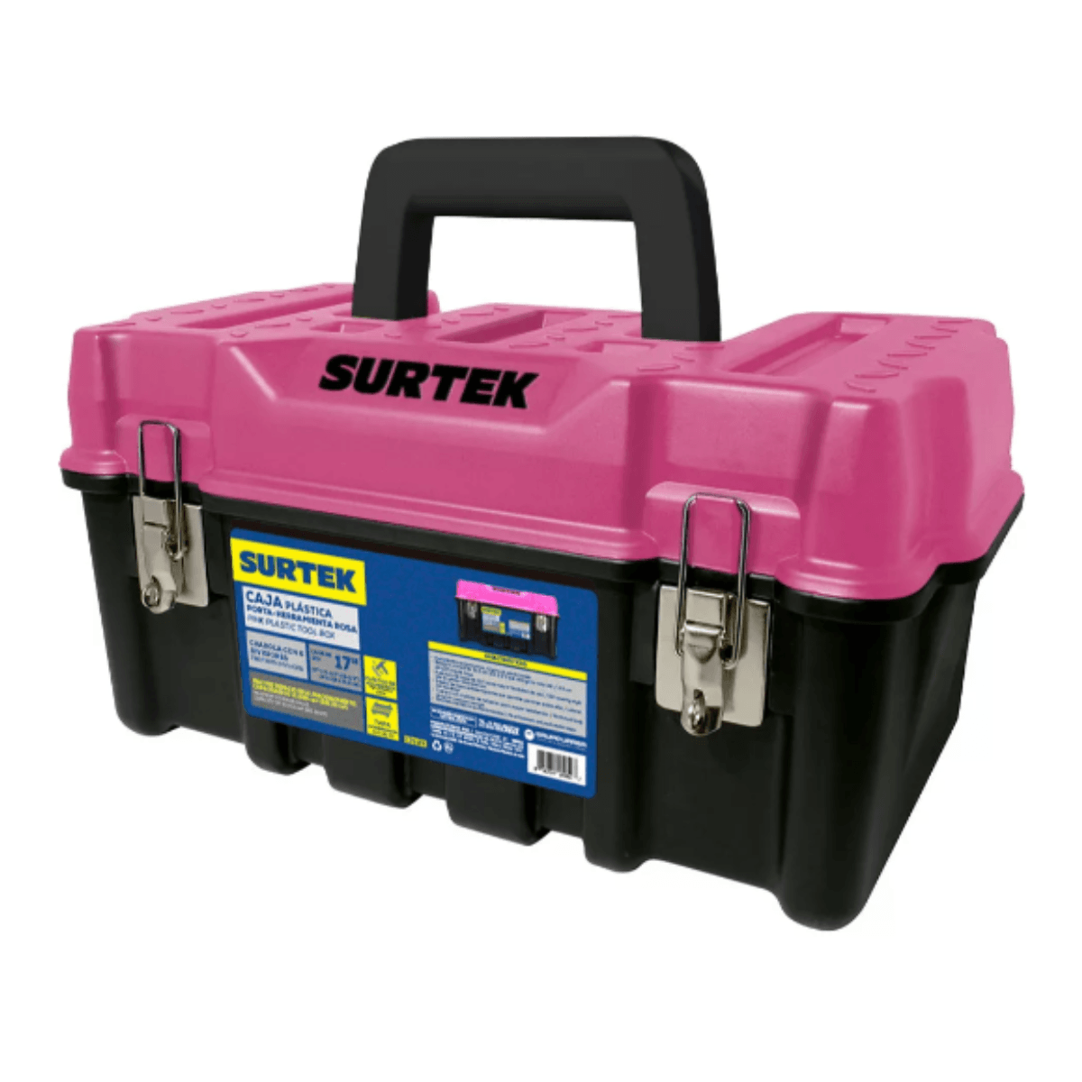 Caja portaherramientas plástica con broches metálicos y tapa rosa 17" x 9" x 8" Surtek