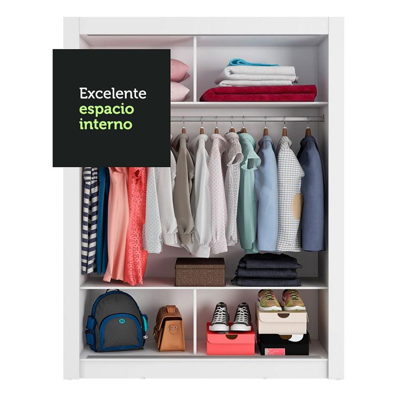 El Closet Denver de Madesa tiene dos puertas corredizas con deslizamientos suaves, rieles superiores e inferiores de aluminio, bisagras metálicas y herrajes de calidad que proporcionan un mejor soporte al mueble. Diseñado perfectamente para una habitación individual, tiene una puerta con espejo, que agranda y da profundidad a la habitación. También es muy práctico para el día a día. El espacio interior es muy bueno, con dos estantes y cuatro nichos, además de un robusto perchero metálico de 105 cm. Tiene espacio para ropa larga, ropa más corta, maletas, accesorios y mucho más. La estructura interior y exterior está acabada con pintura poliéster de 7 capas exclusiva de Madesa. Este método no daña el medio ambiente y protege los muebles durante mucho más tiempo.