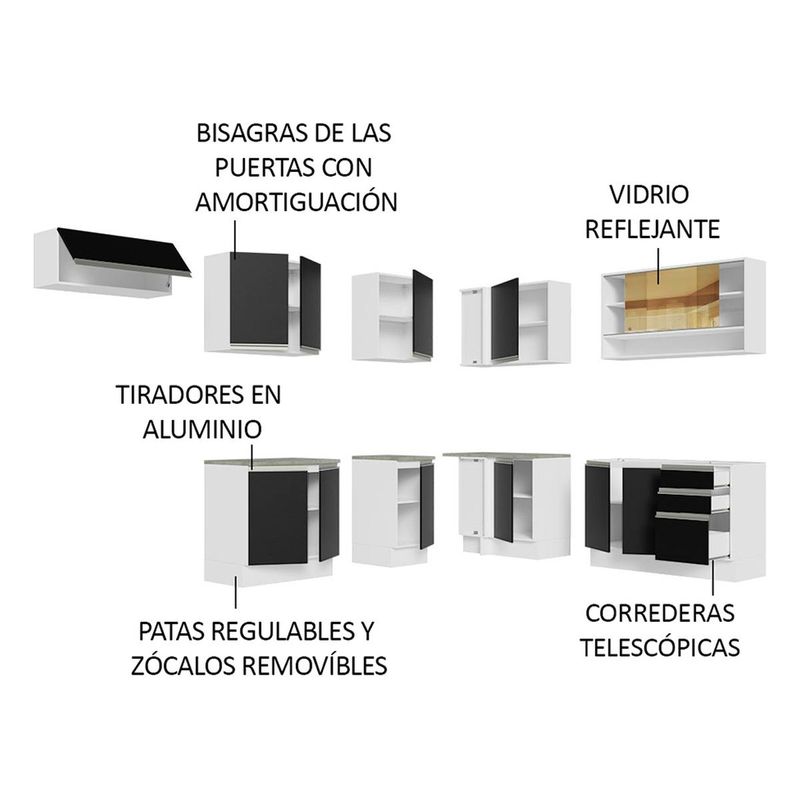 La fabricación se realiza con materiales de alta calidad, como tiradores de aluminio, cajones con correderas telescópicas, puertas con amortiguadores para un cierre suave, pies regulables en PVC y un zócalo removible de MDP.