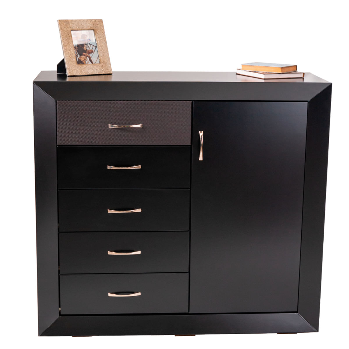 Descubre la armonía perfecta entre estilo y funcionalidad con nuestra espectacular cómoda en elegante acabado negro. Este impresionante mueble ha sido diseñado para elevar la estética de tu recámara, integrándose a la perfección en cualquier decoración. Con amplios cajones y una puerta lateral, te ofrece una solución de almacenamiento óptima: imagina la comodidad de tener a mano todo lo que necesitas, desde ropa y accesorios hasta tus objetos más personales, todos organizados de manera práctica y accesible. Su diseño sofisticado no solo es atractivo, sino que también maximiza el espacio de tu habitación, permitiéndote disfrutar de un ambiente ordenado y estilizado. No dejes pasar esta oportunidad de transformar tu espacio vital; ¡haz tu pedido ahora y disfruta de un dormitorio más funcional y con mucho más estilo!