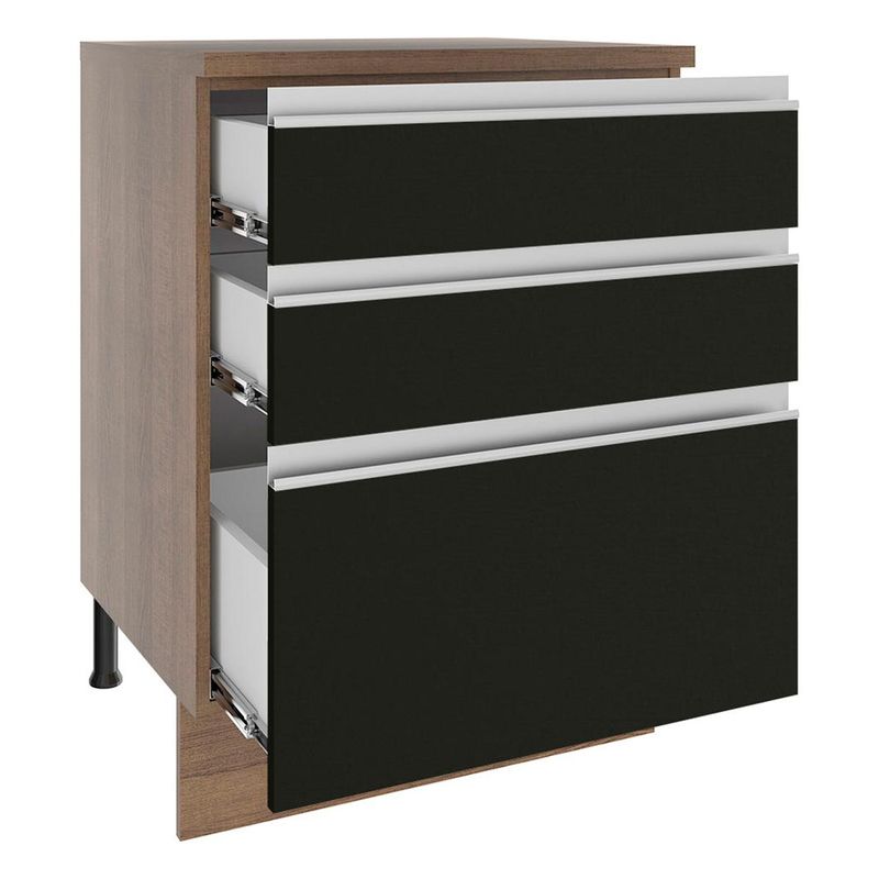 Dispone de 3 cajones grandes, siendo el último más profundo, con tiradores de aluminio y rieles telescópicos que permiten la apertura total de los cajones. Incluye pies de PVC con regulación de altura y zócalo removible en MDP de fácil encaje.