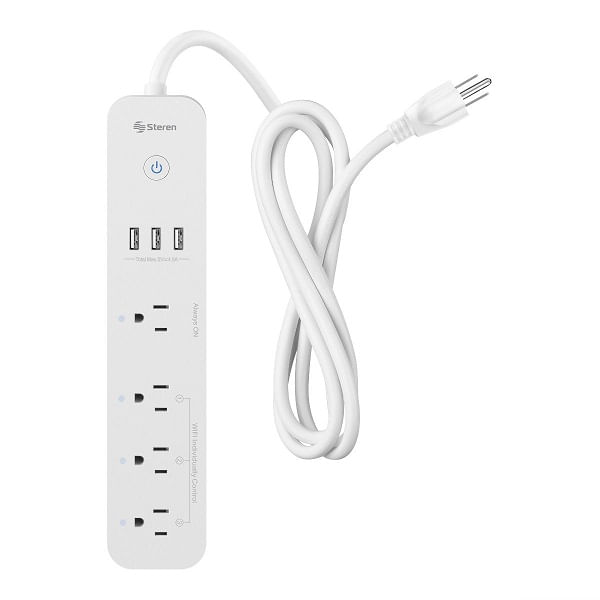 ¡Convierte tu casa en una Smart Home! Con éste multicontacto Wifi* conecta equipos eléctricos para encenderlos y apagarlos, aunque estés fuera de casa. Tiene 3 contactos para control por Internet, 1 contacto siempre energizado y además 3 puertos USB para recargar tu celular o tablet. También cuida tus equipos ya que tiene protección contra picos de voltaje, sobre carga y sobre calentamiento. El control es por medio de la app Steren Home, donde es posible crear horarios de encendido/apagado y rutinas, compartir el control a otros usuarios y mucho más. Es compatible con los asistentes Alexa** y Google* Assistant**, que te dan comodidad de uso dentro de tu hogar al activar o desactivar la tira multicontacto con tu voz.
