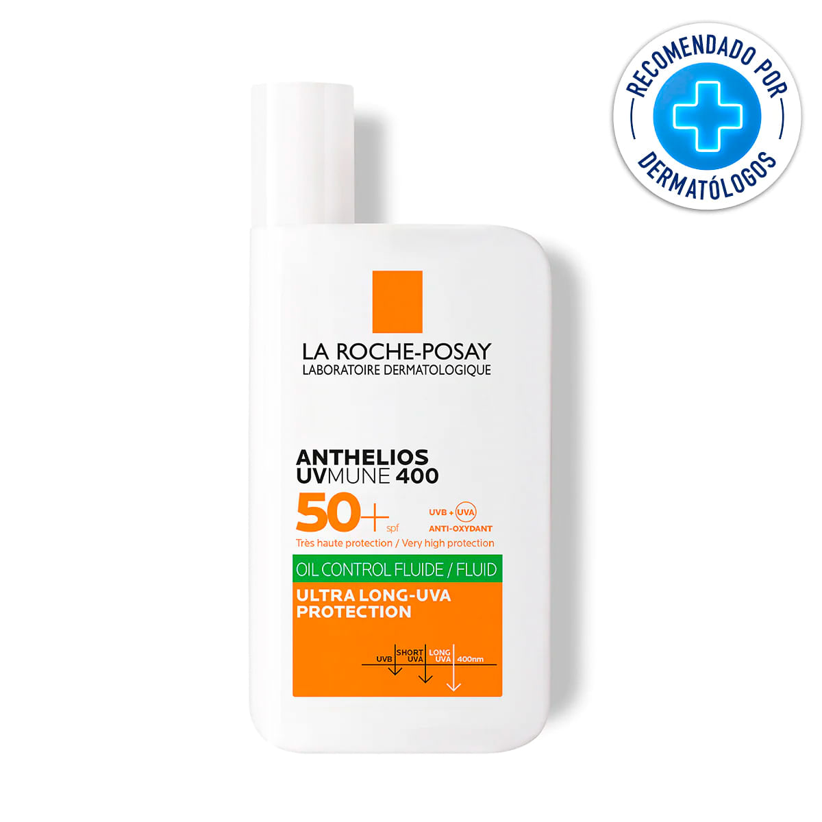 Anthelios UVMUNE 400 Oil Control Fluido FPS 50+, Protector Solar para pieles mixtas a grasas en textura fluida. Brinda un acabado invisible y no graso con +12 horas de efecto matificante en la piel. Muy resistente al agua, al sudor y arena. Formulado para limitar el picor en los ojos, con la máxima protección UVA/UVB.