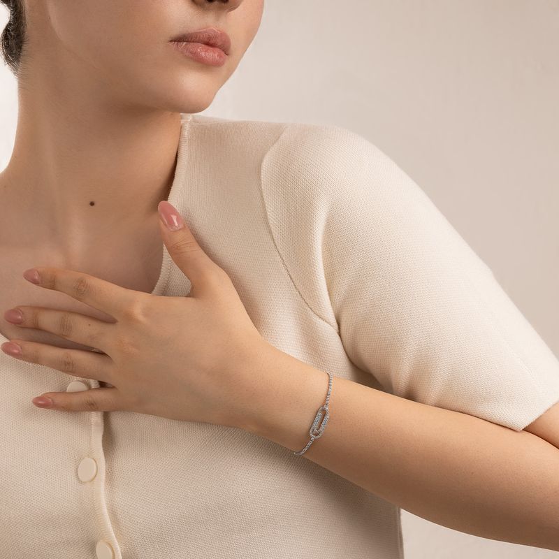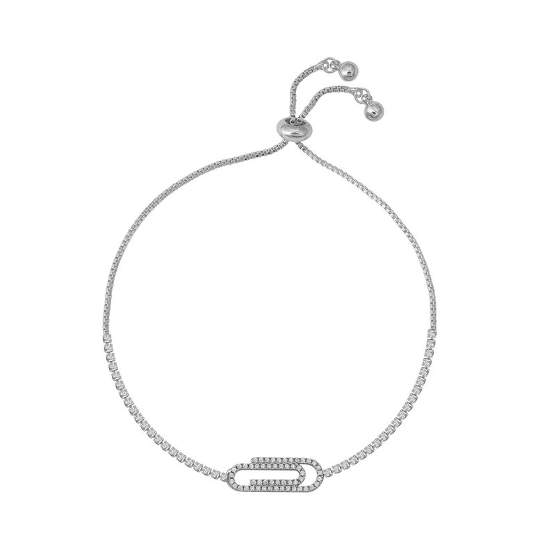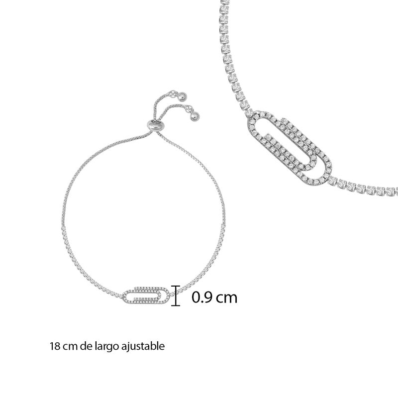 El mejor complemento para tu estilo lo tienes frente a tus ojos. Pulsera ajustable con dije de clip zirconia blanca elaborado en rodio.