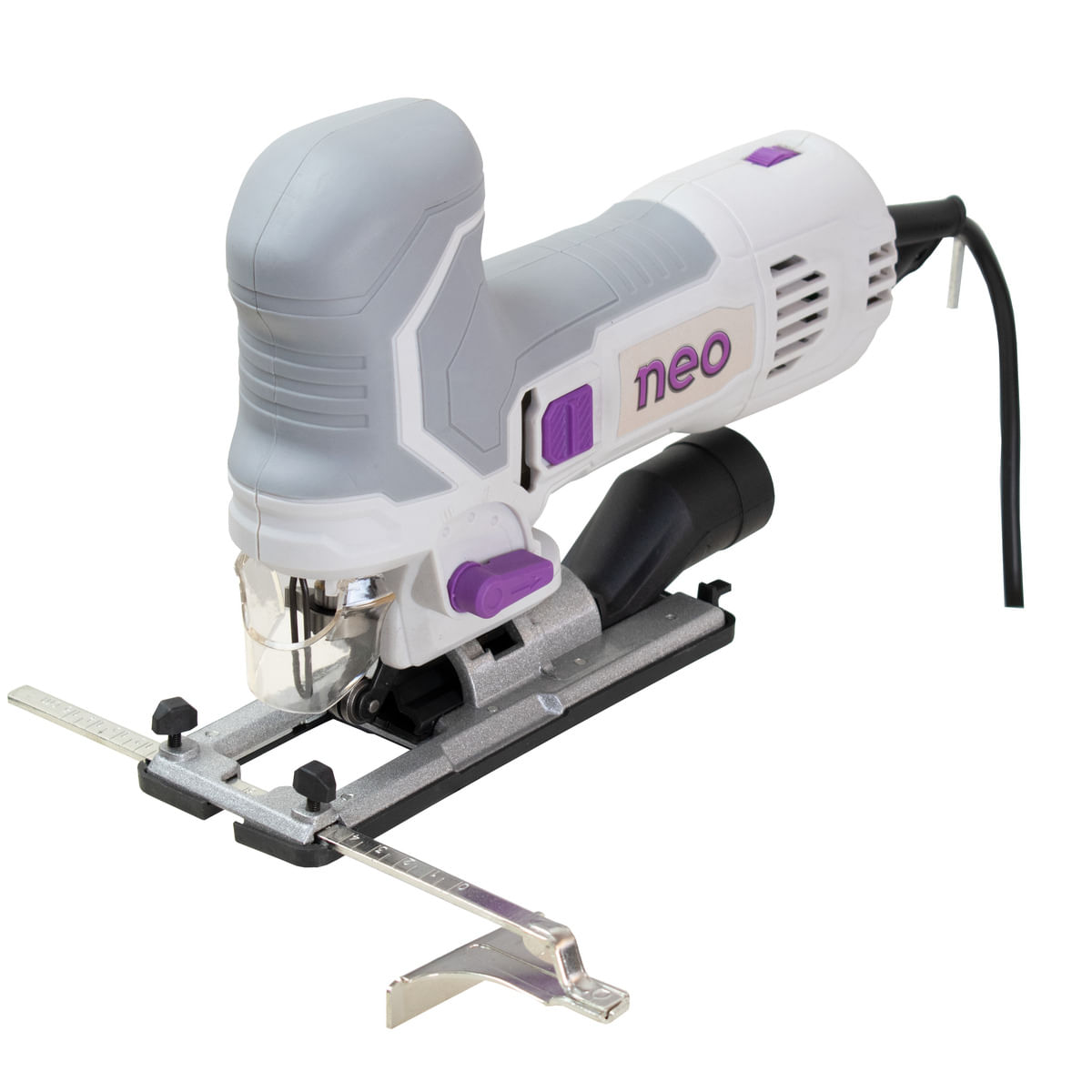 Sierra Caladora de Nivel Industrial Neo, potencia de 800W, Velocidad en Vacio de n0 = 800 - 3000rpm, Acero 3/8", Madera 4", 0 - 45º, 120V 60Hz, Velocidad Variable, cortes en 0° y 45°, Adaptador para bolsa extractora de polvo (No incluida).