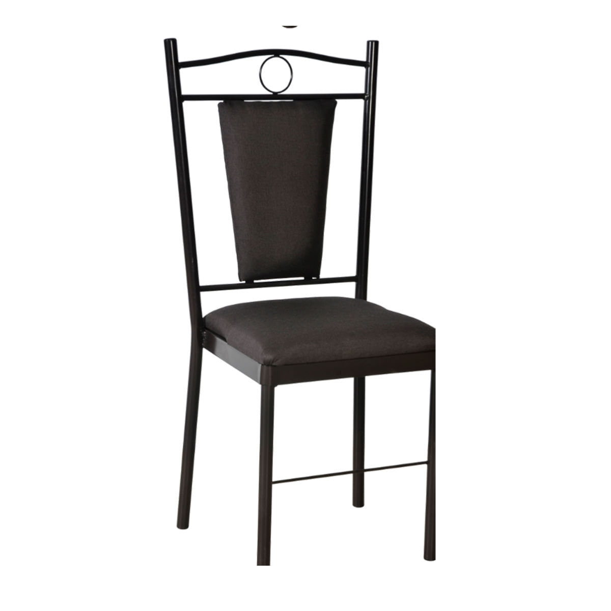 Transforma la atmósfera de tu comedor con una pieza que equilibra la fuerza del diseño industrial con la sofisticación del mobiliario contemporáneo. Silla de comedor con estructura metálica en color negro, respaldo con panel tapizado y detalle superior circular decorativo, asiento acolchonado que ofrece comodidad y estilo contemporáneo.