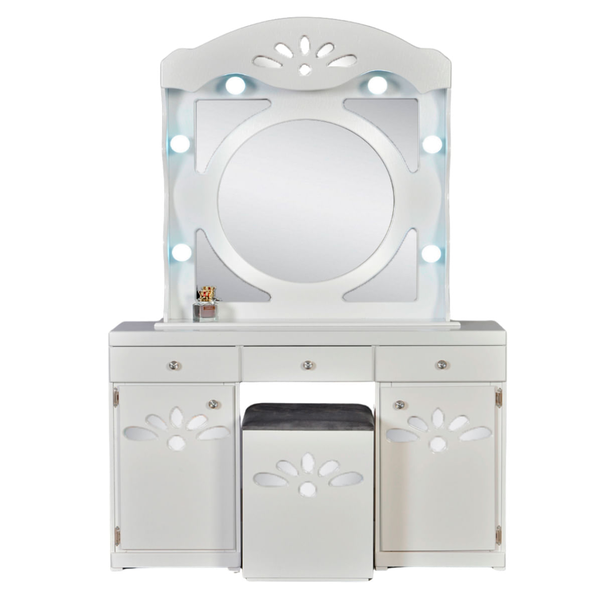 Descubre la fusión perfecta entre elegancia y funcionalidad con nuestro impresionante tocador en un lujoso acabado blanco. Este mueble no solo eleva la estética de tu espacio, sino que también transforma tu rutina de belleza en una experiencia única. Equipado con un espejo circular iluminado, ofrece la luz ideal para un maquillaje impecable y profesional. Los amplios cajones y gabinetes laterales proporcionan un almacenamiento generoso, permitiéndote mantener organizados tus productos de belleza y accesorios favoritos. Para completar esta experiencia, incluye un cómodo banco que te invita a disfrutar de cada momento frente al espejo, haciendo de tu rutina de maquillaje un ritual placentero y relajante. Haz de tu peinado y maquillaje un verdadero placer mientras añades un toque de estilo y practicidad a tu hogar con este esencial tocador.