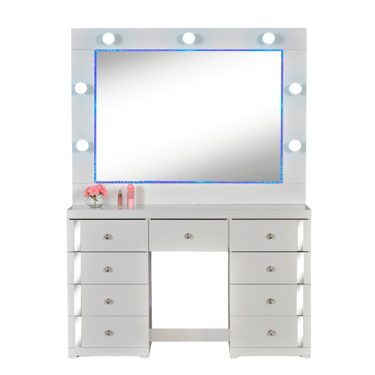 Tocador contemporáneo con un sofisticado acabado en blanco, diseñado para combinar a la perfección funcionalidad y estilo. Este mueble no solo destaca por su impresionante espejo iluminado con tecnología LED, que proporciona una iluminación ideal para aplicar el maquillaje con precisión, sino que también incluye múltiples cajones. Estos espacios de almacenamiento son perfectos para mantener organizados todos tus productos de belleza, accesorios y maquillaje, facilitando un acceso rápido y sencillo a lo que necesitas. Con su diseño moderno y elegante, este tocador transformará tu rutina diaria en una experiencia de lujo y practicidad, convirtiendo cada momento frente al espejo en un deleite.