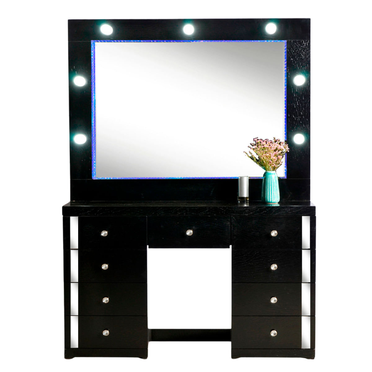 Este sofisticado tocador en un elegante acabado chocolate es el complemento ideal para los amantes de la belleza que buscan un espacio funcional y estilizado. Su espejo con iluminación LED proporciona una claridad excepcional, permitiéndote aplicar tu maquillaje con precisión y sin esfuerzo, incluso en condiciones de poca luz. Además, cuenta con prácticos cajones laterales que ofrecen un amplio espacio de almacenamiento, perfecto para mantener organizados todos tus productos y accesorios de belleza. Con este tocador, no solo transformarás tu habitación en un oasis de glamour, sino que también elevarás tu rutina diaria de cuidado personal a un nuevo nivel de lujo y comodidad. ¡Haz de cada día una experiencia de belleza excepcional!