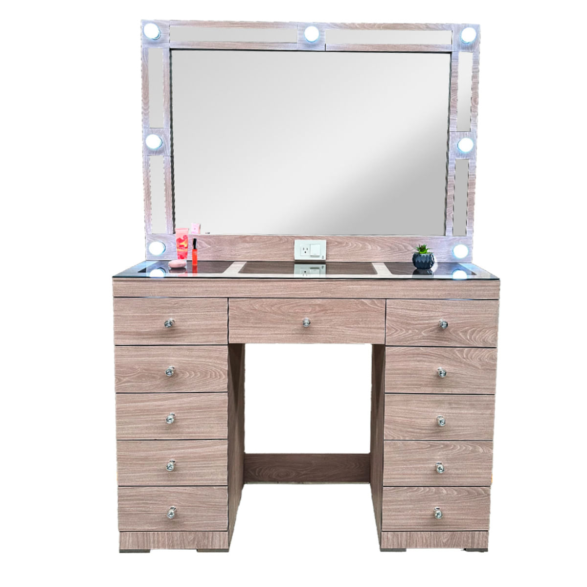 Sumérgete en el lujo y la elegancia de nuestro tocador sofisticado, diseñado con un acabado de madera clara que transforma cualquier habitación en un oasis de estilo. Este mueble no solo es una pieza decorativa, sino que también está equipado con un espejo iluminado que ofrece la luz ideal para resaltar tu belleza en cada rutina. Cada mañana se convertirá en una experiencia excepcional, gracias a sus múltiples cajones laterales, que brindan un extenso espacio de almacenamiento, facilitando la organización de tu maquillaje y artículos personales, todo al alcance de tu mano. Mejora tu rutina diaria y dale un toque especial a tus momentos frente al espejo con este tocador que combina con maestría la funcionalidad y el diseño.